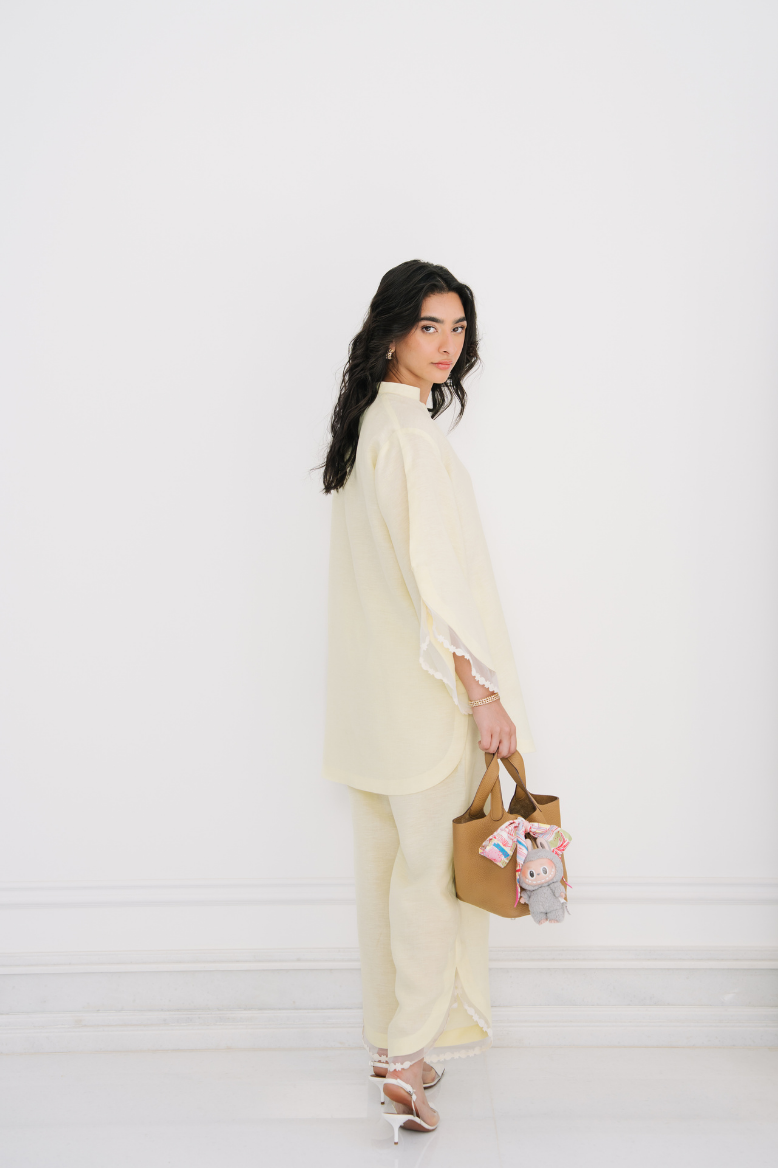 Designed in premium linen with delicate organza and leather trim accents, this set transitions effortlessly from day to night. Available in two colours ideal for the summer season - Butter Yellow and Santal Beige.
