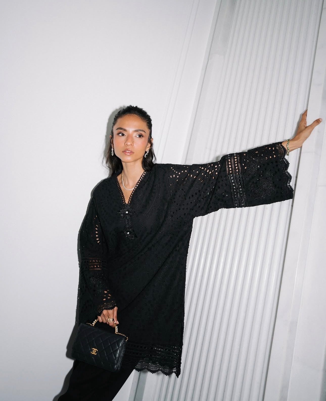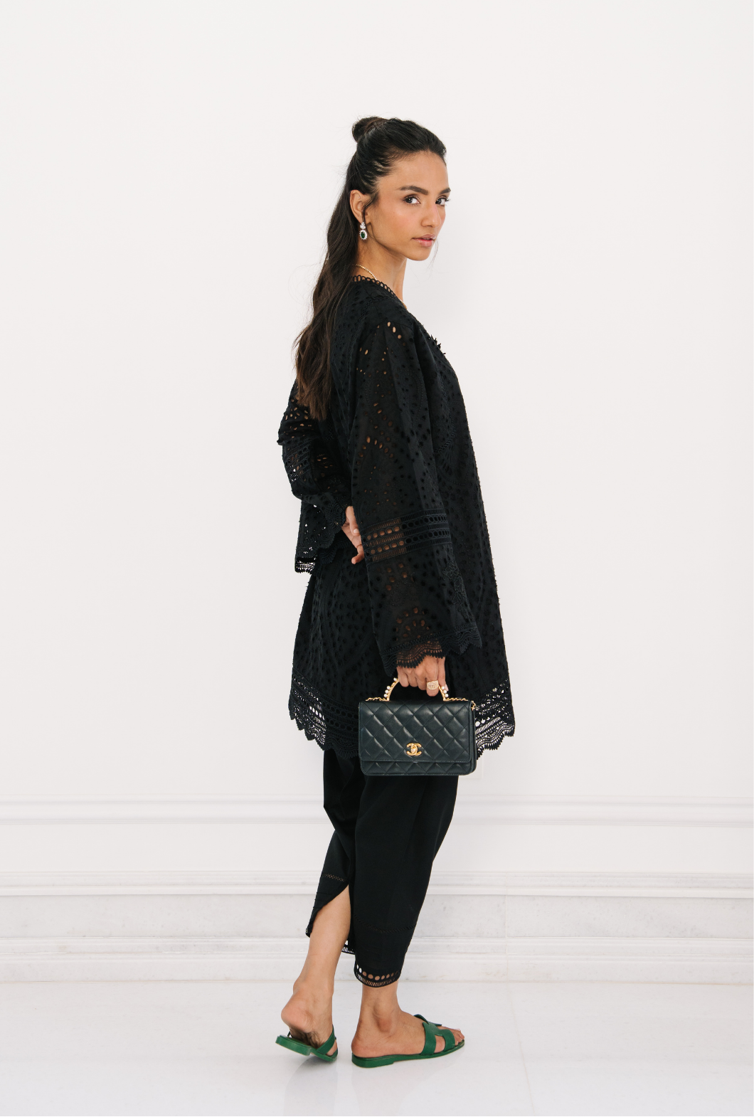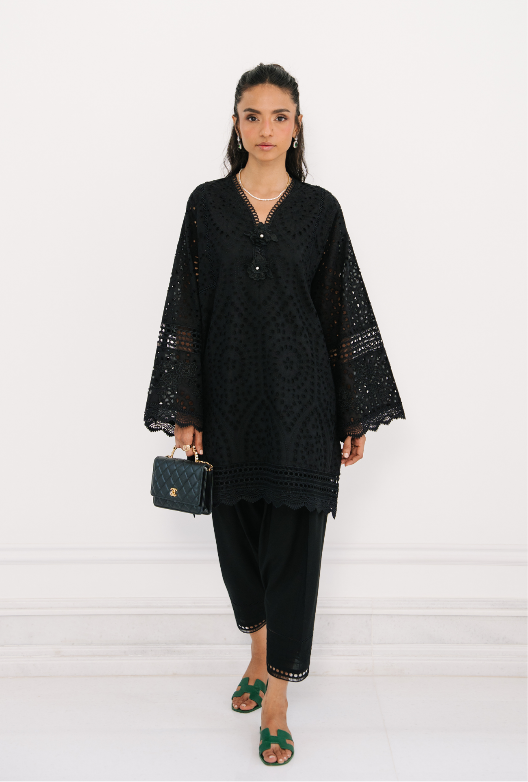 Our Noir Chikan Kari Ensemble is a classic wardrobe staple. It comes with a matching shalwar and is fully lined. The design is elevated with delicate 3D flowers and hand-embellished pearls.