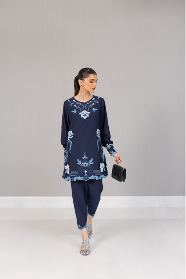 appliqué details. Paired with a skinny shalwar accented with embroidery and cut work.