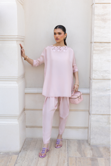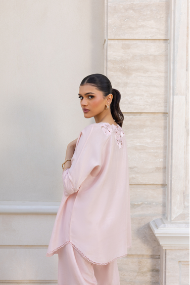 The Selene Set made in Korean raw silk is a two piece ensemble in a light pink colour. Adorned